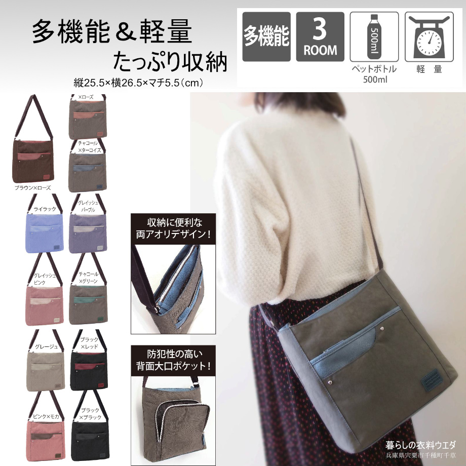 - ¥2,480(税込¥2,726) 【レディース】軽量多機能縦ショルダーバック 3ROOM